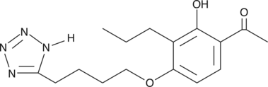 LY171883 is a selective, potent, orally active antagonist of the leukotriene D4 receptor.{1741} Dissociation constants (KB) for LY171883 on guinea pig ileum and parenchyma are 0.07 and 0.34 µM, respectively.{1741} LY171883 is an inhibitor of phosphodiesterase obtained from human polymorphonuclear leukocytes (IC50 of 22.6 µM) and various guinea pig tissues (IC50s range from 6.9-209 µM).{1741} At a concentration of 50-100 µM, LY171883 binds to the PPAR? nuclear receptor, inducing adipogenesis in cultured NIH3T3 fibroblasts.{1618,1425}