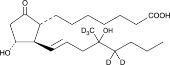 Misoprostol (free acid)-d5 contains five deuterium atoms at the 16 methyl, 17, and 17′ positions. It is intended for use as an internal standard for the quantification of misoprostol (free acid) by GC- or LC-mass spectrometry (MS). Misoprostol is a PGE1 analog with agonist activity mediated by EP2, EP3, and EP4 receptors.{2313,1754,1752,1611} It has been shown to inhibit the formation of gastric lesions in rats (ED50 = 0.31 µg/kg),{1754} inhibit superoxide generation in human neutrophils (EC50 = 0.35 µM),{1752} and relax fetal rabbit ductus arteriosus (EC50 = 0.36 nM){1611} in a concentration dependent manner. Misoprostol is commonly used in clinical medicine for the prevention of peptic ulcer disease. It has also been used in conjunction with RU-486 for the oral induction of first trimester abortion. Misoprostol contains a C-1 methyl ester and is readily absorbed and rapidly hydrolyzed in humans to the active free acid.{2313}