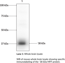 Mitochondrial fission factor (MFF) is a tail-anchored membrane protein with roles in mitochondrial and peroxisomal fission.{55234,59142} It is localized to the outer membrane of mitochondria, as well as the membrane-restricted regions of elongated peroxisomes. It is composed of a cytoplasmic N-terminus that functions as a receptor for the GTPases dynamin-related protein 1 (DRP1) and dynamin-like protein 1 (DLP1), a central coiled-coil domain, and a C-terminal transmembrane domain.{59144} siRNA knockdown of MFF inhibits DRP1 recruitment and mitochondrial fission induced by loss of mitochondrial membrane potential and delays cytochrome c release from mitochondria and apoptotic progression in vitro.{55234,59144} MicroRNA knockdown of MFF inhibits norepinephrine-induced hypertrophy and mitochondrial fission in isolated neonatal rat ventricular cells.{59144} MFF is overexpressed in various cancer cells and knockdown of MFF reduces tumor volume in a PC3 mouse xenograft model.{59143} Cayman’s Mitochondrial Fission Factor Polyclonal Antibody can be used for immunohistochemistry (IHC) and Western blot (WB) applications. The antibody recognizes MFF at approximately 38 kDa from human, bovine, and mouse samples.