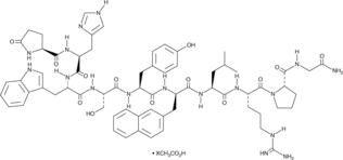 Nafarelin is an agonist of gonadotropin-releasing hormone (GNRH).{40488,40489,40490} It is a long-acting agent that, after an initial increase in sex hormone levels, decreases the level of circulating gonadotropins and sex hormones. In vivo, nafarelin (0.5-2.0 ?g/kg, s.c.) reduces plasma levels of luteinizing hormone and testosterone (Item Nos. 15645 | ISO60154) as well as testicular volume, sperm count, sperm motility, and duration of ejaculation in male dogs.{40488} Nafarelin (32 ?g/animal per day) inhibits estrus in female beagle dogs.{40489} It also reduces the volume of endometrial tissue in a rat model of endometriosis.{40490} Formulations containing nafarelin have been used in the treatment of endometriosis and central precocious puberty.