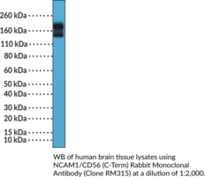 CD56, also known as neural cell adhesion molecule 1 (NCAM1), is a cell surface glycoprotein and member of the immunoglobulin superfamily that is involved in cellular adhesion and neural development.{60124,60125,60126} Alternative splicing of the NCAM1 pre-mRNA produces several isoforms, including two transmembrane isoforms of 180 and 140 kDa, NCAM-180 and NCAM-140, respectively, that differ in size of the cytoplasmic domain, and a 120 kDa isoform, NCAM-120, that lacks the cytoplasmic domain and is linked to the plasma membrane by a glycosylphosphatidylinositol (GPI) anchor.{60124} CD56 is composed of an extracellular N-terminal domain containing five immunoglobulin-like (Ig-like) domains and two fibronectin type III domains that mediate homophilic and heterophilic interactions, a transmembrane domain, and an intracellular C-terminal signaling domain.{60125,60127} It is used as a marker for neural and natural killer (NK) cells, but is also expressed by other immune cells, including monocytes, T cells, and dendritic cells (DCs), as well as tumor cells, in an isoform-dependent manner.{60124,60125,60127} CD56 is increased on NK cells by stimulation with IL-15 or IL-2 and correlates with upregulation of the NK cell activating receptors NKG2D, NKp30, and NKp46 and NK cell-mediated cytotoxicity.{60124,60127} Homophilic CD56 interactions induce neurite outgrowth of cerebellar neurons and promote NK cell-mediated tumor cell lysis in vitro.{60124,60125,60126,60127} The frequency of peripheral blood CD56bright NK cells is increased in patients with melanoma and associated with reduced overall survival.{60128} Cayman’s NCAM1/CD56 (C-Term) Rabbit Monoclonal Antibody can be used for immunohistochemistry (IHC) and Western blot (WB) applications. The antibody recognizes NCAM-180 and NCAM-140 from human samples.