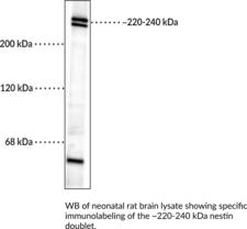 Nestin, also known as neuroepithelial stem cell protein, is a type VI intermediate filament protein.{55198} Nestin monomers are comprised of a short N-terminal head domain that is required for assembly of intermediate filaments, an ?-helical rod domain that mediates dimerization, and a long C-terminal tail.{55198} They form heterodimers and heterotetramers with other intermediate filament proteins, including vimentin and ?-internexin, for assembly into intermediate filaments.{55198,55199} Nestin is found in a variety of tissue types but is expressed primarily in nervous tissue during embryonic development in mammals and has been used as a marker of neural stem/progenitor cells (NSPCs).{55199,55200} Nestin synthesis decreases as nervous tissues differentiate, however, nestin-positive neural stem cells are found in the subventricular zone (SVZ) and hippocampal dentate gyrus in the adult mammalian brain. Nestin is also expressed in a variety of tumor types and cancer stem cells, as well as in cerebellar Purkinje cells from patients with Creutzfeldt-Jakob disease (CJD).{55200,55201} Cayman’s Nestin Monoclonal Antibody can be used for immunocytochemistry (ICC), immunohistochemistry (IHC), and Western blot (WB) applications. The antibody recognizes a nestin doublet at approximately 220 to 240 kDa from human, mouse, and rat samples.