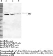 NF-?B p65 is a ubiquitously expressed transcription factor that is a subunit of the NF-?B complex and is encoded by the RELA gene in humans.{53059} It is composed of an N-terminal Rel homology domain, which mediates dimerization, nuclear localization, and DNA and protein interactions, and two C-terminal transactivation domains that are subject to a variety of post-translational modifications and regulate the transcriptional activity of p65.{53059,53060} NF-?B p65 regulates the expression of a large number of genes in response to inflammatory and environmental cues that play critical roles in innate and adaptive immunity and cellular differentiation.{53060} Genome-wide deletion of Rela in mice is embryonic lethal.{5321} Silencing of NF-?B p65 induces tumor cell apoptosis in a murine Lewis lung carcinoma model and decreases secreted levels of IL-1? and TNF-? induced by LPS in THP-1 monocytes.{53061,53062} NF-?B p65 is overexpressed in inflamed joints of patients with rheumatoid arthritis, and naïve CD4 T cells isolated from the whole blood of patients with multiple sclerosis have increased phosphorylation of NF-?B p65.{53065,53066} Cayman’s NF-?B p65 (human, recombinant) protein can be used for Western blot and ELISA applications. Cayman’s NF-?B (p65) Polyclonal Antibody can be used for ELISA and Western blot applications. The antibody recognizes NF-?B at 65 kDa from human samples.