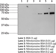 Nitrotyrosine is a post-translational modification that is formed by the nitration of tyrosine.{60009} Under conditions of oxidative stress, tyrosine is oxidized by reactive oxygen species (ROS) or, in the presence of hydrogen peroxide and nitrite, by myeloperoxidase (MPO) to yield a tyrosine radical that reacts with reactive nitrogen species (RNS), such as nitric oxide or peroxynitrite, to form nitrotyrosine. It exists in a free or protein-bound form and is commonly used as a marker of nitrosative or oxidative stress.{31710} Nitrotyrosine residues have been found in a variety of proteins, including LDL, surfactant protein A, angiotensin II, and human and bovine serum albumin.{60010} Free nitrotyrosine production induced by peroxynitrite is inhibited by the polyphenols epicatechin gallate, gallic acid, catechin, or epicatechin in cell-free assays, as well as in aortic rings isolated from normotensive and spontaneously hypertensive rats administered the antioxidant N-acetyl-cysteine (NAC; Item No. 20261).{60011,60012} Nitrotyrosine levels are increased in the affected tissues of numerous pathological conditions, including atherosclerosis, cancer, ulcerative colitis, Alzheimer’s disease, and Parkinson’s disease.{60010} Autoantibodies that recognize nitrotyrosinated proteins are increased in the synovium of patients with rheumatoid arthritis and are positively correlated with joint and tendon inflammation.{60009} Cayman’s Nitrotyrosine Monoclonal Antibody can be used for ELISA and Western blot (WB) applications.