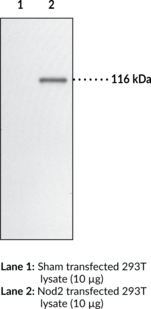 Nod2 is a member of the apoptosis regulating protein family that has caspase recruitment-domains (CARDs) and also includes Apaf-1 and Nod1.{8852} Nod2 contains two N-terminal CARDs, a nucleotide binding domain (NBD), and multiple C-terminal leucine-rich repeats (LRRs). Nod2 is expressed in monocytes whereas Nod1 (CARD4) is expressed in multiple tissues.{8852,12079,8407,12078} Both Nod1 and Nod2 act as intracellular receptors for bacterial lipopolysaccharides, activate NF-kB, and contribute to inflammatory bowel disease.{8407,8408,8855,8859} A frameshift mutation in the NOD2 gene is associated with susceptibility to Crohn’s disease, possibly by causing truncation of the tenth LRR.{8853,8854} Cayman Chemical’s NOD2 Monoclonal Antibody can be used for Western blot and immunohistochemical analysis of Nod2 on samples of human origin. The antibody will also recognize three Nod2 polymorphisms: L1007finsC, G908R, and R702W.{12079}