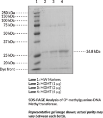 O6-methylguanine-DNA Methyltransferase (MGMT) is a DNA repair enzyme responsible for demethylating O6-methylguanine (O6-mG).{20209} The methylation of guanine at O6 to form O6-mG allows base-pairing to thymine rather than cytosine during DNA replication. MGMT prevents mutations by transferring the methyl group from O6-mG to MGMT cysteine 145, restoring guanine. This transfer results in a covalent bond between MGMT cysteine 145 and the methyl group, and so MGMT is a single-turnover, “suicide” enzyme. The assay used to test MGMT is the demethylation of a synthesized, double-stranded, DNA oligonucleotide.{20210} Demethylation removes an O6-methyl group to expose a restriction site for the restriction endonuclease PvuII. Lanes A-E show 200 ng of methylated dsDNA treated with increasing amounts of MGMT prior to PvuII digestion.