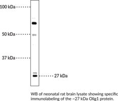 Oligodendrocyte lineage transcription factor 1 (Olig1) is a basic helix-loop-helix transcription factor that promotes the formation and maturation of oligodendrocytes.{55117} It is expressed in the spinal cord and neuroepithelium of the ventral forebrain, colocalizing with the oligodendrocyte precursor markers Sox10 and Pdgfra. Olig1 is localized to the nucleus at the embryonic stage and is translocated to the cytoplasm after birth.{55118} However, Olig1 is translocated back to the nucleus of oligodendrocyte precursors following a demyelinating injury. Olig1-/- mice exhibit delayed, but not impaired, spinal cord oligodendrocyte differentiation and maturation, indicating that Olig1 is non-essential to oligodendrocyte differentiation.{55119} Olig1 knockdown delays mean disease onset and reduces disease severity in a mouse model of myelin oligodendrocyte glycoprotein-induced experimental autoimmune encephalomyelitis.{55120} Cayman’s Olig1 Polyclonal Antibody can be used for immunocytochemistry (ICC), immunohistochemistry (IHC), immunoprecipitation (IP), and Western blot (WB) applications. The antibody recognizes Olig1 at approximately 27 kDa from human, mouse, and rat samples.