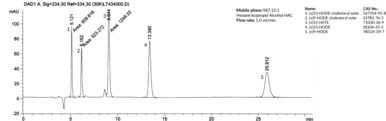 The oxidized lipid HPLC mixture contains a combination of oxidized fatty acids found in atherosclerotic plaques supplied in ethanol. This HPLC mixture contains 5 µg of the following oxidized fatty acids : (±)9-HODE, (±)13-HODE, (±)9-HODE cholesteryl ester, (±)13-HODE cholesteryl ester, and (±)15-HETE.