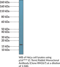 p16INK4A is a negative regulator of the cell cycle encoded by the CDKN2A gene in humans that limits cell cycle progression and promotes cellular senescence.{59614,59615} It induces cell cycle arrest at the G1 phase by binding to cyclin-dependent kinase 4 (Cdk4) or Cdk6 in the cytoplasm, inhibiting formation of the cyclin D1/Cdk4/6 complex. p16INK4A is expressed at low levels during homeostasis and is increased in response to cellular stressors, including oncogene activation and reactive oxygen species (ROS).{59615} It is regulated by a variety of transcriptional, translational, and epigenetic mechanisms, such as chromatin modifications mediated by polycomb repressive complex 1 (PRC1) and PRC2 that inhibit CDKN2A expression.{59614,59615,59616} Aberrant CDKN2A mRNA and p16INK4A protein levels have been found in tumor biopsies from patients with a variety of cancers, including colon, breast, gall bladder, or head and neck cancer.{59615} CDKN2A SNPs have been found in patients with follicular lymphoma and are associated with reduced overall survival.{59617} Cayman’s p16INK4A (C-Term) Rabbit Monoclonal Antibody can be used for immunohistochemistry (IHC) and Western blot (WB) applications.
