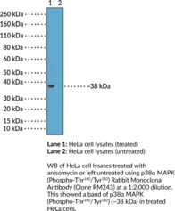 p38 MAPK is a serine/threonine protein kinase and member of the MAPK family with roles in the regulation of immune responses and embryonic development, as well as cell differentiation, metabolism, and survival.{60066,60067} It exists as 4 isoforms, p38?, -?, -?, and -?, encoded by MAPK14, MAPK11, MAPK12, and MAPK13, respectively, in humans. p38? MAPK is ubiquitously expressed, with the highest levels of expression in the heart, skeletal muscle, and brain.{60066,60068} It is activated via dual phosphorylation of threonine 180 (Thr180) and tyrosine 182 (Tyr182) by the MAP2K kinases MKK3 and MKK6 in response to LPS or the production of inflammatory cytokines and induces signaling through protein kinases, transcription factors, and transcriptional regulators, among others.{60066,60067} Levels of activated p38? MAPK (p38? phospho-Thr180/Tyr182) are increased and positively correlated with apoptosis in DU145 and PC3 prostate cancer cells in response to cisplatin (Item No. 13119).{60070} p38? Phospho-Thr180/Tyr182 levels are also increased in adult rat ventricular monocytes during stimulated ischemia.{60071} Cayman’s p38? MAPK (Phospho-Thr180/Tyr182) Rabbit Monoclonal Antibody can be used for immunohistochemistry (IHC) and Western blot (WB) applications. The antibody recognizes p38? MAPK (phospho-Thr180/Tyr182) at approximately 38 kDa from human samples.