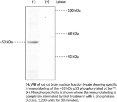 p53 is a transcription factor and tumor suppressor encoded by TP53 in humans with roles in cell cycle arrest, apoptosis, senescence, differentiation, and DNA repair.{59774,59775} It is composed of two N-terminal intrinsically disordered transactivation domains (TADs), a proline-rich domain (PRD), a DNA-binding domain (DBD), a tetramerization domain (TD), and an intrinsically disordered C-terminal domain.{59774} p53 is ubiquitously expressed, with protein levels increasing under conditions of extra- or intracellular stress, such as DNA damage, oncogene activation, oxidative stress, or hypoxia.{59776} It is activated and translocated to the nucleus in response to cellular stress via post-translational modifications, such as phosphorylation, methylation, and acetylation, where it binds p53 consensus DNA-binding elements and regulates transcription of its target genes in a cell-, tissue-, and stress signal type-specific manner.{59774,59776} p53 is phosphorylated at Ser392 by I?B kinase ? (IKK?) in glutamine-deficient cancer cells.{60852} Loss-of-function and/or gain-of-function mutations in TP53 occur in approximately 50% of human cancers.{59775} Cayman’s p53 (Phospho-Ser392) Polyclonal Antibody can be used for Western blot (WB) applications. This antibody recognizes p53 at ~53 kDa from human and rat samples.