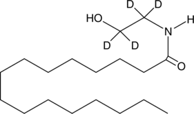 Palmitoyl ethanolamide-d4 (PEA-d4) contains four deuterium atoms at the 1,1′, 2, and 2′ positions. It is intended for use as an internal standard for the quantification of PEA by GC- or LC-mass spectrometry. Palmitoyl ethanolamide (PEA) is an endogenous cannabinoid found in brain, liver, and other mammalian tissues.{2415} PEA has also been isolated from egg yolk, and found to have anti-anaphylactic and anti-inflammatory activity in vitro.{1633} PEA is an endocannabinoid which has been shown to significantly elevate cAMP in cells expressing CB2 receptors. However, its affinity for CB2 receptors is relatively low, at about 10 µM. CB1 receptors have no appreciable affinity for PEA.{1134}