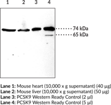 PCSK9 is a member of the subtilisin serine protease family with an important role in low-density lipoprotein (LDL) metabolism.{13178} Mutation in the PCSK9 gene is associated with autosomal dominant hypercholesterolemia which is characterized by an increase in LDL cholesterol levels.{13158} PCSK9 overexpression in wild-type mice doubles the plasma total cholesterol, possibly through acceleration of the degradation of the LDL receptor.{13176,13178} PCSK9 mRNA is detected in various tissues such as liver, kidney, lung, spleen, jejunum, ileum, colon, and muscles with the highest expression in the liver.{13136} Human PCSK9 precursor is 692 amino acids in length with an estimated molecular weight of 74 kDa. This proprotein is self-cleaved to form a mature protein of 63 kDa in the Golgi.{13177}