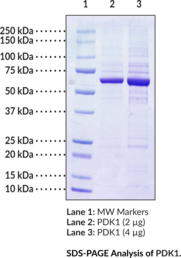 3-Phosphoinositide-dependent protein kinase 1 (PDK1) is a serine/threonine kinase with roles in cell survival, differentiation, and proliferation, metabolic regulation, and immune development.{65465,65466,65467} It is composed of an N-terminal bilobular kinase domain, with the small lobe housing a PIF-pocket/?C-helix region and the large lobe containing an activation loop, and a C-terminal PH domain.{65465} PDK1 is activated by autophosphorylation of serine 241 in the activation loop, a residue that is poorly accessible to phosphatases, and is considered constitutively active.{65465} It phosphorylates and activates various members of the AGC protein kinase family, including Akt, p70 ribosomal S6 kinase (p70S6K), serum/glucocorticoid regulated kinase (SGK), and PKC to regulate the PI3K/Akt, Ras/MAPK, and Myc signaling pathways.{65465,65466} Gene amplification of PDPK1, the gene encoding PDK1, is associated with poor prognosis in patients with breast cancer and metastasis in patients with prostate cancer.{65465} Knockdown of Pdpk1 promotes axon regeneration in a mouse model of sciatic nerve injury and inhibits T follicular helper (Tfh) cell differentiation and germinal center responses in a mouse model of acute lymphocytic choriomeningitis virus (LCMV) infection.{65466,65467} Cayman’s PDK1 (human, recombinant) protein is expressed with an N-terminal His-TEV tag, which is removed during the protein purification process, leaving behind an N-terminal glycine residue on the full-length protein. This protein can be used for the phosphorylation of other proteins, such as Akt, and Western blot (WB).