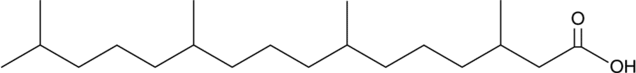 Phytanic acid is a saturated 20-carbon branched-chain fatty acid which can only be derived from dietary sources. In cases of peroxisomal disorders, elevated levels of phytanic acid have been observed, and this is linked to diseases such as infantile phytanic acid storage disease and Refsum’s disease.{1912}