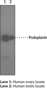 Podoplanin is a transmembrane glycoprotein that has roles in development, immunology, and cancer.{64186,64187} It is composed of a glycosylated extracellular domain, which is critical for podoplanin-induced platelet activation, a single transmembrane region that associates with CD9 and CD44, and a short cytoplasmic tail that interacts with the ezrin-radixin-moesin (ERM) family of proteins to promote rearrangement of the actin cytoskeleton, as well as the epithelial-to-mesenchymal transition (EMT) during embryonic development.{64187} Podoplanin is expressed in various tissues during murine embryonic development but is predominantly restricted to stromal, lymphatic endothelial, and immune cells, lymphoid organs, and the heart and choroid plexus in the adult mouse.{64186,64187} Its expression is upregulated by various pro-inflammatory cytokines, including IL-22, IL-6, IFN-?, and TGF-?, and is increased in T cells, fibroblasts, and macrophages during inflammation. It localizes to the cell surface within lipid rafts where it interacts with numerous proteins to modulate cell adhesion and motility.{64186} Podoplanin binds to C-type lectin receptor 2 (CLEC-2), which is expressed on platelets, to induce platelet aggregation and activation, an effect that is inhibited by the interaction of podoplanin with CD9. Mice implanted with MCF-7 cells overexpressing podoplanin exhibit reduced primary tumor growth but enhanced tumor lymphangiogenesis and lymph node metastasis.{64188} Tumor podoplanin expression is associated with reduced overall survival in patients with oral squamous cell carcinoma (OSCC).{64189} Cayman’s Podoplanin Monoclonal Antibody (Clone NZ-1.2) can be used for flow cytometry (FC) and Western blot (WB) applications. The antibody recognizes podoplanin at ~42 kDa from human samples.