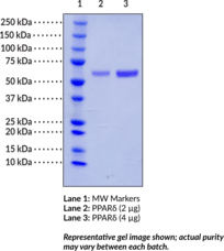 Peroxisome proliferator-activated receptors (PPARs) are members of the nuclear receptor family of ligand activated transcription factors that heterodimerize with retinoic acid like receptors, regulating gene expression and differentiation.{7654} The PPAR family of nuclear hormone receptors consists of three subtypes encoded by separate genes: PPAR?, PPAR? (also referred to as hNUC1, PPAR?, or FAAR), and PPAR?. PPAR? is ubiquitously expressed but is particularly abundant in tissues such as liver, intestine, kidney, abdominal adipose, and skeletal muscle, all of which are involved in lipid metabolism.{10670} PPAR? is a mediator of diverse physiological functions including lipid and cholesterol homeostasis, embryo implantation, and cancer development.{6570,7166,9142,7771} Most recently, attention has been focused on the role of PPAR? in obesity.{11581} Cayman’s PPAR? protein is purified from a baculovirus overexpression system. The purity was determined using gel electrophoresis followed by coomassie staining.