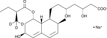 Pravastatin-d3 is intended for use as an internal standard for the quantification of pravastatin (Item Nos. 10010342 | 10010343) by GC- or LC-MS. Pravastatin is a potent and competitive HMG-CoA reductase inhibitor (Ki = 2.3 nM for the active, open ring form of the molecule) that is a ring-hydroxylated metabolite of mevastatin (Item No. 10010340).{15312} In vivo, pravastatin reduces total plasma cholesterol levels by 29% in dogs when administered at a dose of 20 mg/kg per day for five weeks. Formulations containing pravastatin have been used to reduce LDL cholesterol and triglyceride levels and increase HDL cholesterol in the prevention of cardiovascular disease.