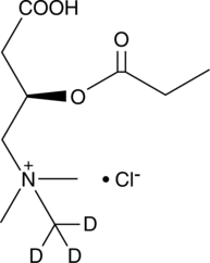 Propionyl-L-carnitine-d3 is intended for use as an internal standard for the quantification of propionyl-L-carnitine (Item No. 9001873) by GC- or LC-MS. Propionyl-L-carnitine is a naturally occurring carnitine derivative formed by carnitine acetyltransferase during ?-oxidation of uneven chain fatty acids.{24843} Propionyl-L-carnitine increases the basal release of prostaglandin E2 (PGE2; Item No. 14010) and 6-keto Prostaglandin F1? (Item No. 15210) in carrageenan-stimulated isolated rat peritoneal cells contaminated with neutrophils and increases the basal release of thromboxane B2 (TXB2; Item No. 19030) in non-contaminated cells.{24843} It reduces the production of reactive oxygen species (ROS) and decreases the expression of NADPH oxidase 2 (NOX2), NOX4, and ICAM-1 in human umbilical vein endothelial cells (HUVECs). It also increases the rate of revascularization and the hind limb vascular area in a rabbit model of hind limb ischemia when administered at a dose of 10 mg per animal.{47116} Propionyl-L-carnitine reduces mitochondrial dysfunction induced by ischemia, preventing mitochondrial calcium overload, and depletion of ATP tissue stores in a rabbit model of ischemia.{47117}