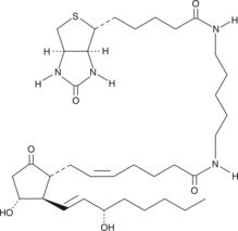 Prostaglandin E2 (PGE2) is the major eicosanoid product of cyclooxygenase-1 and 2 in epithelial cells, leukocytes, reproductive tissues, and many others. PGE2 contracts smooth muscle, protects the gastric mucosa, modulates immune function, and regulates fertility and implantation. PGE2 acts through at least four 7-transmembrane G protein-coupled receptors, EP1-EP4. PGE2-biotin is an affinity probe which allows PGE2 to be detected through an interaction with the biotin ligand. PGE2-biotin was designed to allow PGE2 to be detected in complexes with transmembrane receptors and/or nucleic acid or protein binding partners. It is thus a tool to be used in the general elucidation of the mechanism of action of PGs.