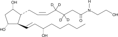 Prostaglandin F2? ethanolamide (PGF2?-EA-d4) contains four deuterium atoms at the 3, 3′, 4, and 4′ positions. It is intended for use as an internal standard for the quantification of PGF2?-EA by GC- or LC-mass spectrometry. PGF2?-EA is produced by cyclooxygenase 2 (COX-2) metabolism of the endogenous cannabinoid arachidonoyl ethanolamide (AEA) found in brain, liver, and other mammalian tissues.{2415} AEA can be metabolized by fatty acid amide hydrolase (FAAH) to give free arachidonic acid, which is the well known and conventional substrate for COX enzymes. However, it has also been reported that AEA can be used directly by COX-2 to produce ethanolamide congeners of the classical prostaglandins, including PGE2.{5089} PGF2?-EA has also been reported to be biosynthesized by this mechanism when AEA was infused into the lung and liver of living mice. PGF2?-EA is a potent dilator (EC50 = 58 nM) of the cat iris sphincter, which is a model system for testing potential intraocular hypotensive agents.{8671}