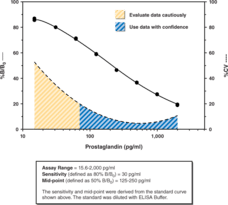This assay was developed for screening applications in which the relative amount of prostaglandin (PG) production for a large number of cell culture samples must be determined. Our PGE2 assay (Item No. 514010) is unparalleled in sensitivity and specificity, but the steep standard curve can make screening many samples tedious. The specificity of the PGE2 assay also eliminates quantification of other PGs which may be produced by the cells. The antiserum used in this assay exhibits high cross reactivity for most PGs which will allow quantification of all the PGs in a given sample with a single assay. The broad standard curve minimizes the need for sample dilution. Because this assay will also recognize thromboxane B2 (TXB2), cell culture media must not contain fetal calf serum (FCS). The high concentration of TXB2 in serum (approximately 400 ng/ml) will completely displace the tracer, making PG measurement impossible.