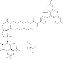 The phosphatidylinositol (PtdIns) phosphates represent a small percentage of total membrane phospholipids. However, they play a critical role in the generation and transmission of cellular signals.{4096,8344} PtdIns-(4,5)-P2-fluorescein is a fluorescent probe for any protein with a high-affinity binding interaction with inositol-(4,5)-triphosphate phospholipids, such as PI3K, PTEN, or PH-domain-containing proteins.