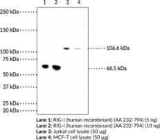 Retinoic acid-inducible gene I (RIG-I), also known as DDX58, is a cytosolic DExD/H-box RNA helicase and an immune sensing receptor encoded by DDX58 in humans.{48287} It is composed of a C-terminal repressor domain, a central RNA helicase domain, and two N-terminal caspase recruitment domains (CARDs).{48287,48288} Following recognition of viral dsRNA by the C-terminal and helicase domains, the helicase domain induces an ATP-dependent conformational change, allowing for interaction of the CARD domains with mitochondrial antiviral-signaling protein (MAVS) and induction of a type I interferon (IFN) response.{48287,48288,48289} RIG-I levels are elevated in the epidermis of patients with psoriasis.{48288} DDX58 expression is decreased in tumor tissues from patients with hepatocellular carcinoma (HCC) compared to nontumor hepatic tissue, and low DDX58 expression is associated with poor disease prognosis.{46559} Cayman’s RIG-I Monoclonal Antibody (Clone 1E3) can be used for Western blot, ELISA, and immunohistochemistry applications. The antibody recognizes RIG-I at 106.6 kDa from human and mouse samples.