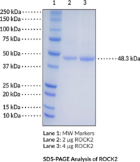 Rho-associated protein kinase 2 (ROCK2) is a serine/threonine kinase that has roles in cytoskeletal organization and autoimmunity, as well as cell survival, proliferation, and apoptosis.{60550,60551,61836} It exists as a homodimer where each monomer is composed of an N-terminal kinase domain, a coiled-coil region that contains the Rho-binding domain, and a C-terminal pleckstrin homology (PH) domain that contains a cysteine-rich C1 domain and acts as an autoinhibitory region.{60552,60551} Rock2 mRNA is expressed in brain, muscle, heart, lung, and placenta, localized to the cytosol and nucleus, associated with the centrosome, and co-localized with actin and vimentin in a cell-type-specific manner.{60550,60551} Binding of ROCK2 to GTP-bound RhoA induces activation of ROCK1, which phosphorylates a variety of downstream targets, including myosin light chain (MLC) phosphatase 1 (MYPT1) and MLC2, that have diverse roles in cytoskeletal organization.{60551} Additionally, ROCK2 is cleaved and activated by proteases, including granzyme B and caspase-2, to induce apoptosis.{60550} Pharmacological inhibition of ROCK2 restores immune homeostasis and shifts the helper T (Th17)/regulatory T (Treg) cell balance towards Tregs in various animal models of autoimmunity and chronic graft versus host disease (GVHD).{61836} Rock2 knockdown decreases the fibrogenic response in a mouse model of diabetic kidney disease.{61837} Cayman’s ROCK2 (human, recombinant) protein can be used for enzyme activity assays.