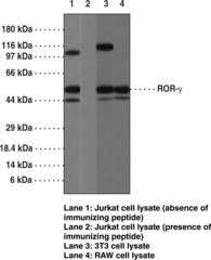 ROR? is a 560 amino acid novel DNA-binding transcription factor belonging to the ROR/RZR orphan nuclear receptor subfamily. The specific functions of this protein are not known. However, reports suggest that this protein is a ligand activated transcription factor and may be essential for lymphoid organogenesis (lymph nodes and Peyer’s patches) and may play an important regulatory role in controlling apoptosis during thymopoiesis. ROR? inhibits the expression of Fas ligand and IL2 and directs the differentiation program of proinflammatory IL-17+ T helper cells. ROR-? shares 50 to 51% sequence identity with ROR? and ROR? and is 88% identical to mouse ROR?. It is highly expressed in skeletal muscle and at lower levels in various other tissues.