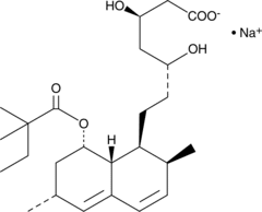 Simvastatin is a competitive inhibitor of HMG-CoA reductase (Ki = 0.12 nM).{15312} Simvastatin reduces plasma cholesterol levels in rats and dogs when administered at doses of 1.2 and 8 mg/kg, respectively.{15310} Simvastatin suppresses TNF-induced NF-?B activation (IC50 = ~13 µM) and potentiates apoptosis in human myeloid leukemia cells.{15363} It also inhibits glutathione peroxidase 4 (GPX4) activity, increases malondialdehyde (MDA) levels, and induces ferroptosis in MDA-MB-231 and MCF-7 breast cancer cells.{62465} Formulations containing simvastatin have been used in the treatment of dyslipidemias.