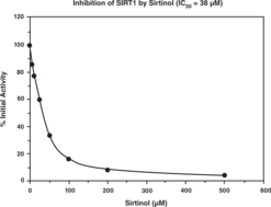 Sirtuins (SIRTs) represent a distinct class of trichostatin A-insensitive lysyl-deacetylases (class III HDACs). Human SIRT1 is the homolog of yeast Silent information regulator 2 (Sir2) and has been shown to regulate the activity of the p53 tumor suppressor and inhibit apoptosis. Small molecule activators of SIRT1, such as resveratrol, extend lifespan in yeast and C. elegans in a manner that resembles caloric restriction. However, this activation of SIRT1 is under much debate. It was determined that the in vitro activation of SIRT1 and Sir2 by resveratrol was a substrate-specific event (i.e., the binding of resveratrol to SIRT1 promoted a conformational change that better accommodated the attached coumarin group in the peptide substrate). Additional research needs to be done to further elucidate the mechanism behind SIRT1 activation, as well as, to establish its role in aging, cancer, and neurodegenerative disease. Cayman’s SIRT1 Direct Fluorescent Screening Assay Kit provides a convenient fluorescence-based method for screening SIRT1 inhibitors or activators. The procedure requires only two easy steps, both performed in the same microplate. In the first step, the substrate, which comprises the p53 sequence Arg-His-Lys-Lys(e-acetyl)-AMC, is incubated with human recombinant SIRT1 along with its cosubstrate NAD+. Deacetylation sensitizes the substrate such that treatment with the developer in the second step releases a fluorescent product. The fluorophore can be easily analyzed using an excitation wavelength of 350-360 nm and an emission wavelength of 450-465 nm.