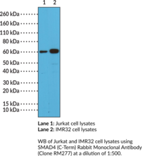 SMAD4, also known as deleted in pancreatic carcinoma locus 4 (DPC4), is a tumor suppressor and a signal transduction protein that functions as a central mediator of the TGF-? and bone morphogenic protein (BMP) signaling pathways.{59633,59634} It is comprised of an N-terminal MH1 domain that binds DNA, a linker region containing a C-terminal SMAD activation domain essential to SMAD4 transcriptional activity, and a C-terminal MH2 domain that interacts with the MH1 domain of other SMAD proteins to facilitate homo- and heterodimerization.{59634} SMAD4 is ubiquitously expressed and localized to both the nucleus and cytosol.{59633} Upon TGF-? or BMP receptor activation, SMAD4 forms complexes with phosphorylated SMAD2 and SMAD3 or SMAD1, SMAD5, and SMAD8, respectively, which are translocated to the nucleus to induce cell cycle arrest and apoptosis.{59634} Homozygous deletion of, or intragenic inactivation mutations in, SMAD4 have been found in pancreatic and colorectal cancers. Heterozygous mutations in SMAD4 have been found in approximately 20% of patients with juvenile polyposis syndrome and are positively correlated with manifestation of hereditary hemorrhagic telangiectasia.{59635} Cayman’s SMAD4 (C-Term) Rabbit Monoclonal Antibody can be used for immunohistochemistry (IHC) and Western blot (WB) applications.