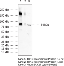 TANK-binding kinase 1 (TBK1) is a non-canonical inhibitor of NF-?B kinase (IKK) that has an essential role in regulating inflammatory responses to pathogens.{35096} Following activation of toll-like receptors by viral DNA, TBK1 interacts with various partners such as STING, MAVS, and TANK to phosphorylate and activate interferon regulatory factors (IRFs) 3 and 7 as well as DEAD-box helicase 3 X-linked (DDX3X), which leads to transcriptional activation of pro-inflammatory and antiviral genes including interferon (IFN) subtypes ? and ?.{35096,35098} TBK1 induces nuclear translocation of NF-?B to initiate a pro-inflammatory response via phosphorylation of NF-?B inhibitor ? (NF?BI?), IKK?, or NF-?B p65 subunit (RelA).{35099} Cytosolic localization of E. coli, Salmonella, and S. pyogenes increases in TBK1-/- murine embryonic fibroblasts, macrophages, and epithelial cells, suggesting TBK1 maintains vacuolar integrity, which is critical to bacterial clearance.{35095} TBK1 phosphorylates the autophagy receptor optineurin to enhance binding of ubiquitin-like microtubule-associated protein light chain 3 (LC3) modifiers and induce autophagic clearance of S. enterica.{35097} It also binds to severe acute respiratory syndrome coronavirus 2 (SARS-CoV-2) non-structural protein 13 (Nsp13), a helicase-triphosphatase and component of the viral replicase-transcriptase complex.{55024} Cayman’s TBK1 Monoclonal Antibody (Clone 4E6) can be used for ELISA, Immunohistochemistry (IHC), and Western blot (WB) applications. The antibody recognizes TBK1 at approximately 84 kDa.