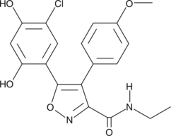 The heat shock proteins (Hsps) act as molecular chaperones. Hsp90 is an abundant protein with roles in protein folding, cell signaling, and cancer. VER-50589 is an isoxazole compound that inhibits Hsp90 with an IC50 value of 21 nM.{16496} It produces a mean cellular antiproliferative GI50 value of 78 nM when tested against a human cancer cell line panel.{16496} Consistent with inhibition of Hsp90, VER-50589 induces the expression of Hsp27 and Hsp72 while reducing the client proteins C-RAF, B-RAF, survivin, and PRMT5, causing cell cycle arrest and apoptosis.{16496} VER-50589 shows favorable pharmacokinetics and impairs tumor growth in animals.{16496} Importantly, glioblastoma cells do not acquire resistance to VER-50589 and resistance to other Hsp90 inhibitors does not produce cross-resistance to VER-50589.{17993}