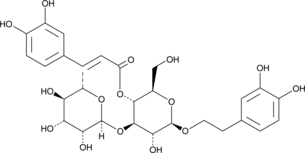 Verbascoside is a natural phenylpropanoid glucoside that has been found in a variety of plants, including B. cordata, B. officinalis, and S. vulgaris, and has diverse biological activities.{42167,42168,42171,42169,42170} Verbascoside is a PKC inhibitor (IC50 = 25 ?M).{42168} It inhibits the growth of Gram-positive and Gram-negative bacteria with MIC values ranging from 4 to 128 ?g/ml including S. aureus and E. coli (MICs = 16 and 32 ?g/ml, respectively).{42171} Verbascoside (0.1-10 ?g/ml) dose-dependently reduces extracellular hydrogen peroxide concentrations and increases cell viability of PC12 cells following 1-methyl-4-phenylpyridinium ion (MPP+) administration to induce apoptosis and oxidative stress.{42167} It also inhibits the growth of MGC803 human gastric adenocarcinoma cells in a dose-dependent manner when used at concentrations ranging from 10 to 20 ?M with maximal growth inhibition of 53%.{42169} In a rat model of colitis induced by 2,4-dinitrobenzene sulfonic acid (DNBS), verbascoside (0.2-2 mg/kg) reduces colon damage and the expression of TNF-?, IL-1?, and inducible nitric oxide synthase (iNOS).{42170}